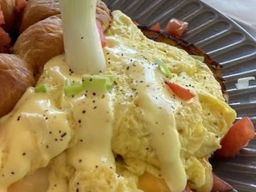 Tomatoes , ham, spinach, 2 scrambled eggs, Hollandaise, cheese
